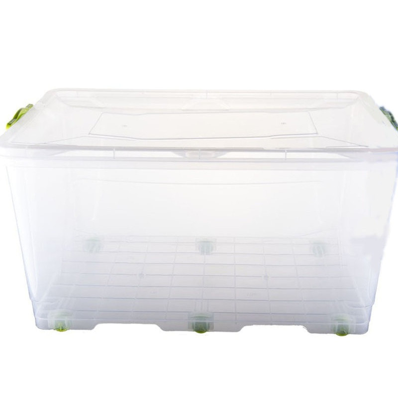 Бокс контейнер пластмасовий Big Box 50л харчовий, з ручками засувками, на коліщатках, призначений для зберігання та транспортування продуктів, речей, одягу, дитячих іграшок та інших дрібних побутових предметів. Універсальний контейнер прямокутної форми комплектується кришкою, яка щільно закривається та додатково фіксується ручками контейнера, це перешкоджає випадковому відкриттю кришки, а також береже речі від вогкості та пилу. Завдяки невеликим коліщаткам у кількості 6 штук, прикріпленим до днища контейнера, не потрібно щоразу піднімати ящик з речами або продуктами, досить просто висунути його. Прозорі стінки боксу дозволяють бачити вміст у ньому. Бокс контейнер виготовлений з високоякісного харчового пластику, який може контактувати з їжею, абсолютно безпечний для здоров'я, не містить шкідливих речовин.