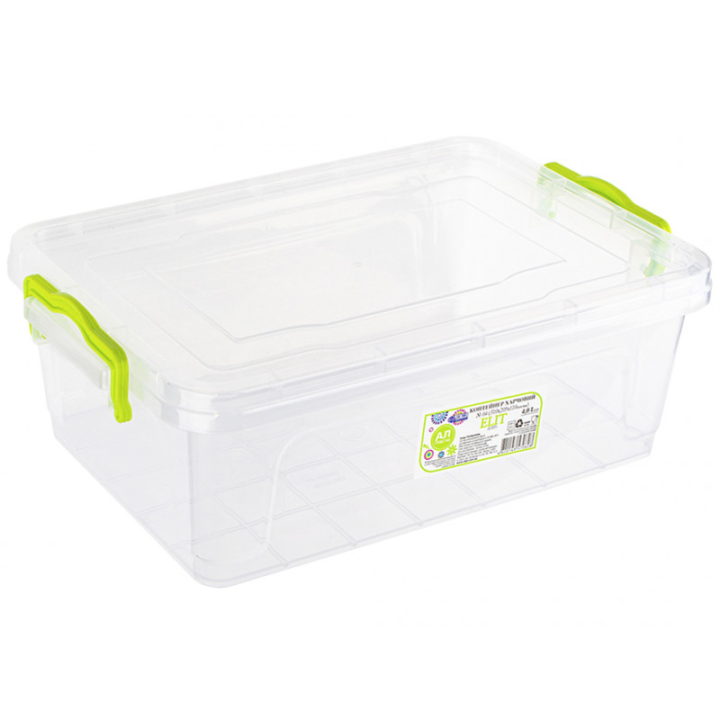 Бокс контейнер пластмасовий плоский 4л універсальний, харчовий з ручками засувками, призначений для зберігання, транспортування продуктів чи готових страв та їх заморожування чи розігріву. Ємність прямокутної форми комплектується кришкою, яка щільно закривається та додатково фіксується ручками контейнера, це перешкоджає випадковому відкриттю кришки. Прозорі стінки судочка дозволяють бачити вміст у ньому. Бокс виготовлений з високоякісного харчового пластику, який може контактувати з їжею, абсолютно безпечний для здоров'я, не містить шкідливих речовин. Судочок харчовий з ручками засувками підходить для використання в посудомийній машині, холодильнику, морозильній камері, мікрохвильовій печі.