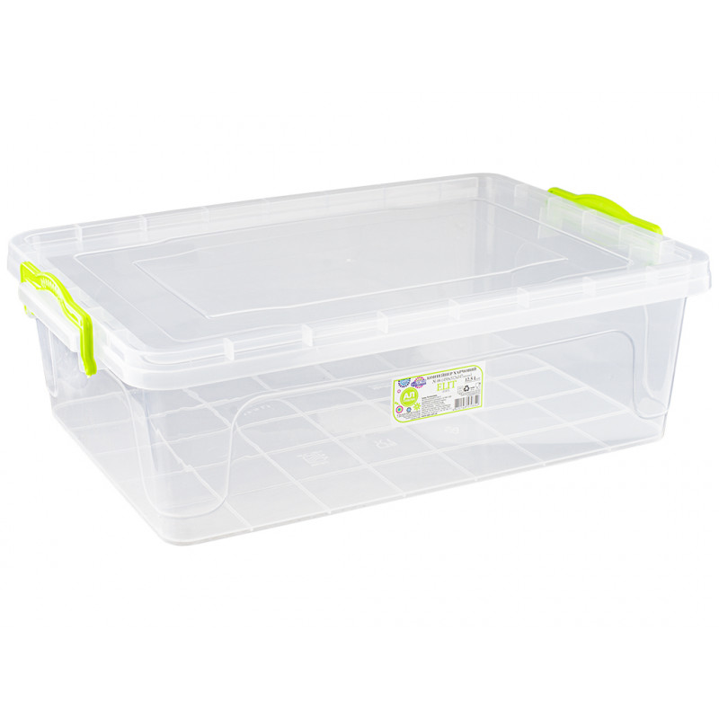 Бокс контейнер пластмасовий плоский 7л універсальний, харчовий з ручками засувками призначений для зберігання, транспортування продуктів або готових страв та їх заморожування або розігріву, а також може використовуватися для зберігання дитячих іграшок та інших необхідних дрібниць домашнього використання. Ємність прямокутної форми комплектується кришкою, яка щільно закривається та додатково фіксується ручками контейнера з двох сторін, це перешкоджає випадковому відкриттю кришки. Прозорі стінки судочка дозволяють бачити вміст у ньому.