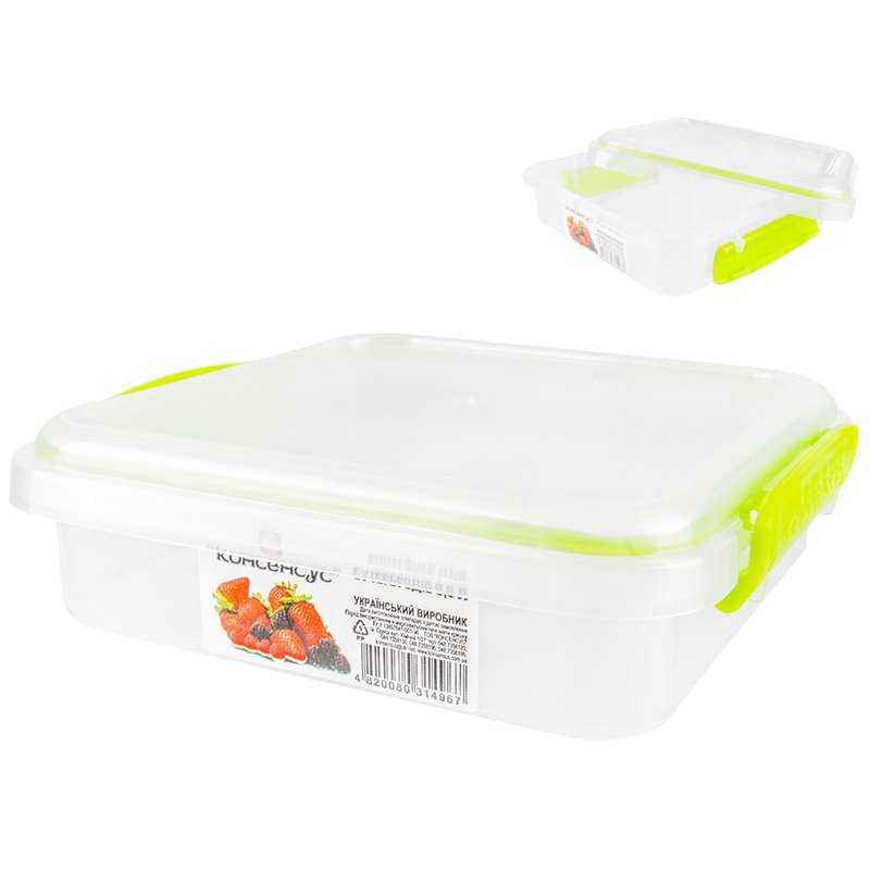 Контейнер універсальний, харчовий призначений для зберігання, транспортування продуктів або готових блюд і їх заморожування або розігрівання. Ємність комплектується кришкою, яка щільно закривається і додатково фіксується ручками контейнера, це перешкоджає випадковому відкриттю кришки. Прозорі стінки судка дозволяють бачити вміст в ньому.