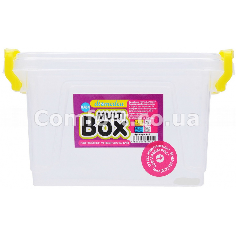 Контейнер 0,45л А-2 універсальний, харчовий призначений для зберігання, транспортування продуктів або готових блюд і їх заморожування або розігрівання. Ємність прямокутної форми комплектується кришкою, яка щільно закривається і додатково фіксується ручками контейнера, це перешкоджає випадковому відкриттю кришки. Прозорі стінки судка дозволяють бачити вміст у ньому. Бокс виготовлений з високоякісного харчового пластика, який може контактувати з їжею, абсолютно безпечний для здоров'я, не містить шкідливих речовин. Підходить для: посудомийної машини, холодильника, морозильної камери, мікрохвильової печі.