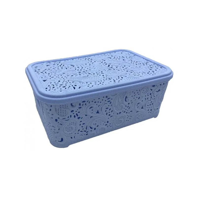 Кошик ажур 4,7л з кришкою призначений для зберігання предметів, дрібних речей, чудово підійде для зберігання білизни, дитячих товарів, іграшок, косметики, канцелярського або швацького приладдя, і інших корисних дрібниць. Контейнер виготовлений з високоякісного кольорового пластика, безпечного для здоров'я. Конструкція органайзера для зберігання ажур з кришкою є прямокутним контейнером, на бічних стінках є отвори для циркуляції повітря, з їх допомогою кошик зручно переносити.