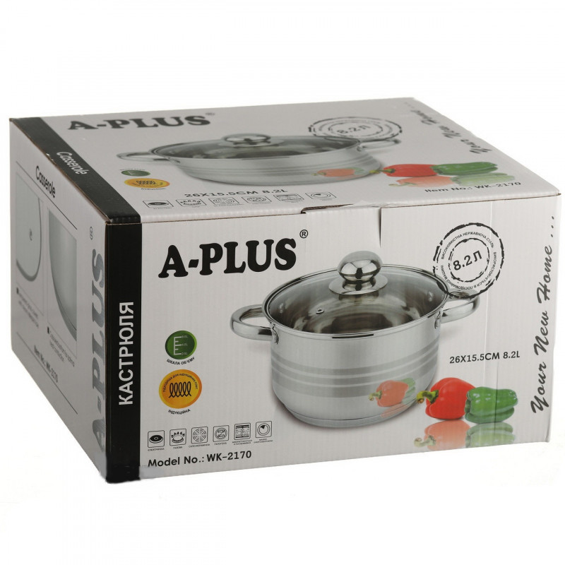 Каструля A - PLUS 10л 2171 виготовлена з високоякісної нержавіючої сталі, яка гарантує практичність, довговічність і бездоганний зовнішній вигляд посуду. Капсульне дно дозволяє рівномірно розподіляти і значно довше зберігати тепло по стінках і дні посуду, що запобігає пригоранню їжі і забезпечує швидше приготування блюд. У комплекті йде скляна кришка з отвором для випуску пари. Ручки ергономічної форми виконані із сталі, кріплення - клепкове, ручки не нагріваються. Каструля підходить для усіх типів плит. Стильний оригінальний дизайн, простота у відході і використанні, довговічність - ось відмінні риси цього посуду.