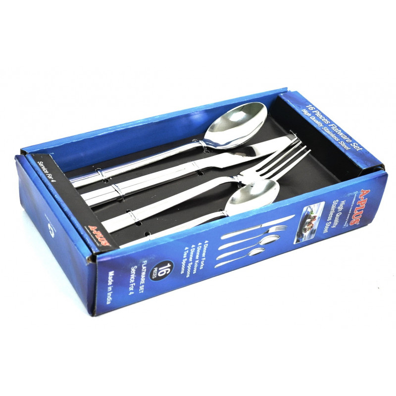 Набір складається з 16 столових предметів, для вашої зручності набір упакований в коробку для компактного зберігання, завдяки чому цей товар може бути відмінним подарунком. Предмети в наборі виготовлені з нержавіючої сталі високої якості, з дзеркальною поліровкою. Цей метал не вступає в реакцію з їжею під час експлуатації, тобто не міняє її смак і запах. Товар є міцним і довговічним, легко очищається навіть в прохолодній воді. Такі вилки, ложки і ножі мають сучасний дизайн, зручні в господарстві, ідеальний вибір для подарунка. Набор столовий стане багатофункціональним помічником для кожної хазяйки і на будь-якій кухні їдальні, кафе або ресторану. Столовий набір чудово підійде для устаткування громадського харчування.