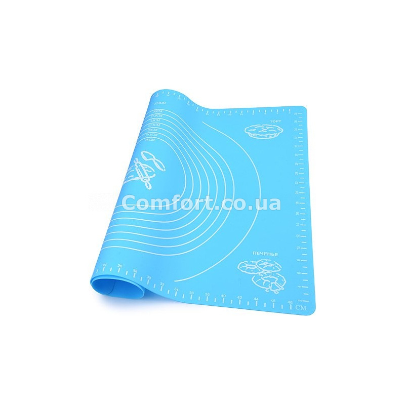 Килимок виготовлений з якісного харчового і термостійкого кольорового силікону, що забезпечує його довговічність і надійне використання. Килимок силіконовий відмінно лягати на робочу поверхню і не ковзає при розкочуванні тесту. Поверхня килимка не вимагає посипання борошном, оскільки тісто не прилипає до силікону. Нанесена на силіконовий килимок розмітка дозволяє працювати з тестом без додаткових вимірів.