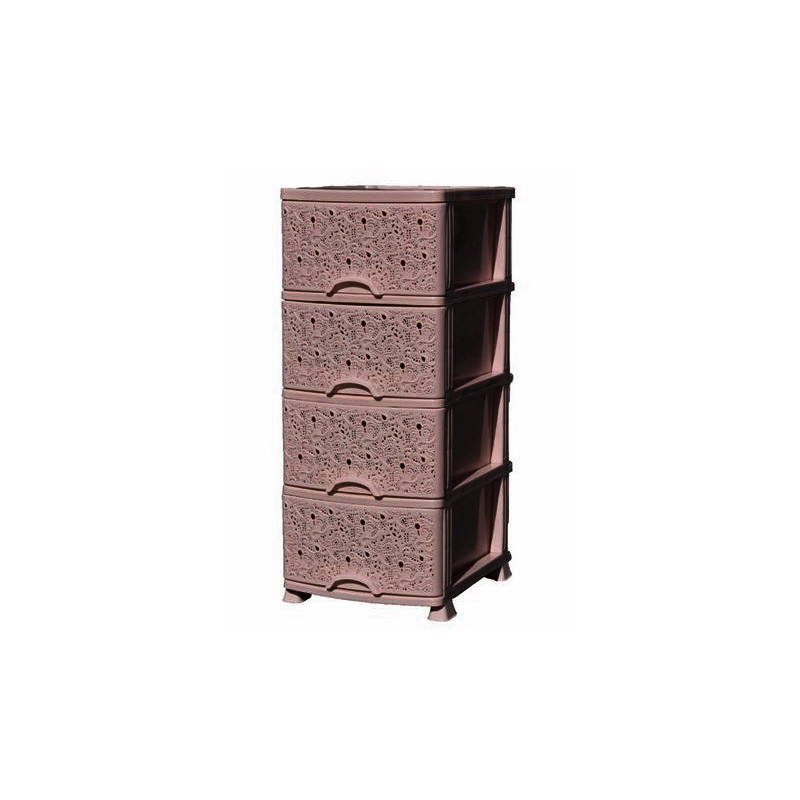 Комод ажурний пластмасовий має чотири висувні ящики, в які легко поміщаються усі необхідні речі. Комод використовується для зберігання одягу, постільної білизни, дитячих іграшок, предметів особистої гігієни, банного приладдя, косметики, рушників, серветок і інших необхідних дрібниць. Підлоговий комод виготовляють з кольорової високоякісної пластмаси, декорують ажурним візерунком.