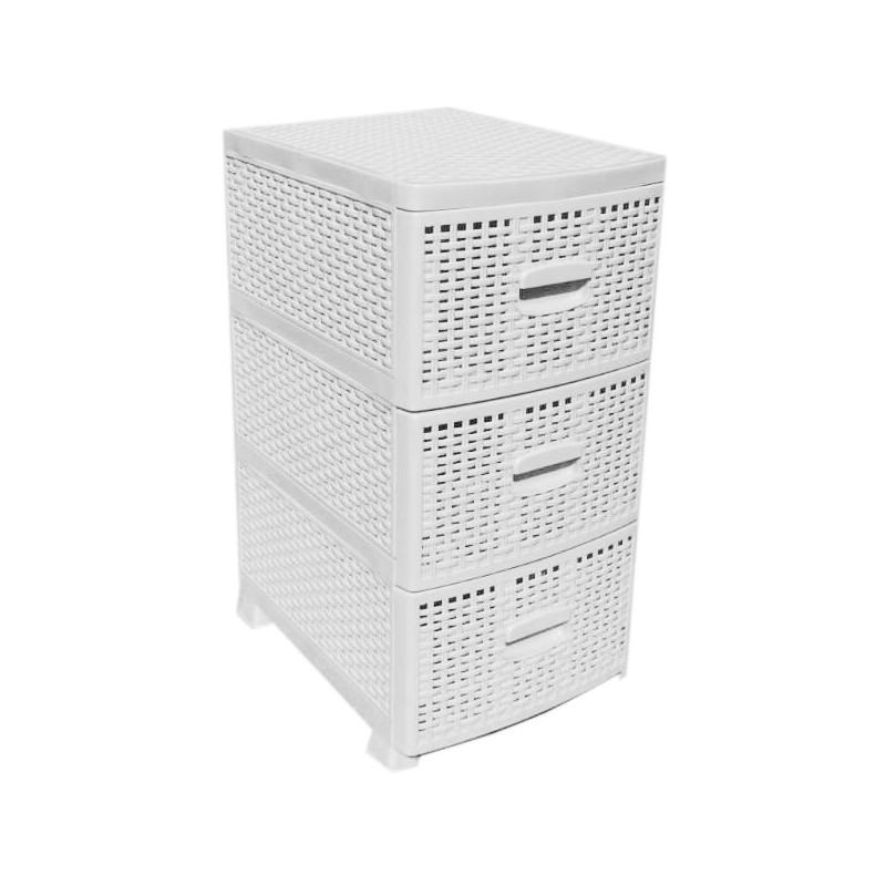 Комод ротанг пластмасовий має три висувні ящики, в які легко поміщаються усі необхідні речі. Комод використовується для зберігання одягу, постільної білизни, дитячих іграшок, предметів особистої гігієни, банного приладдя, косметики, рушників, серветок і інших необхідних дрібниць. Підлоговий комод виготовляють з кольорової високоякісної пластмаси, декорують під плетіння ротанг.