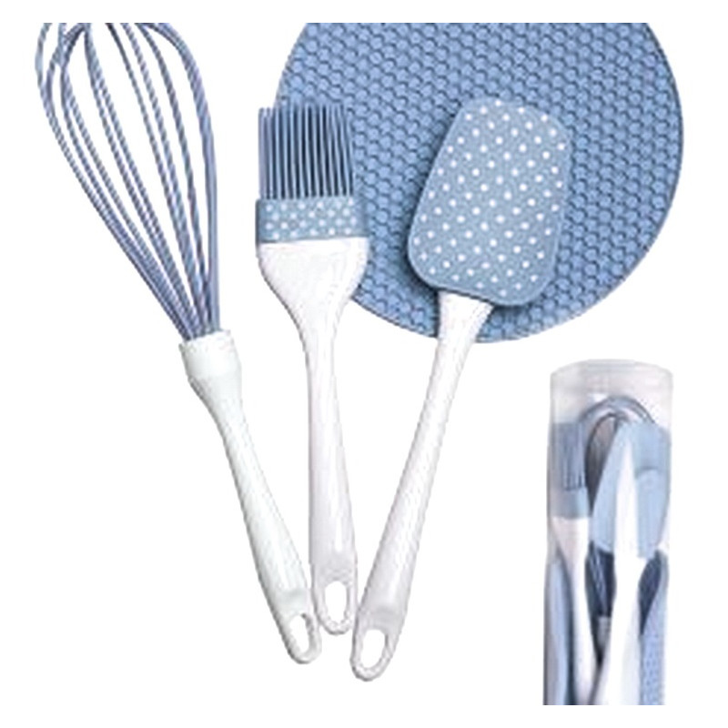 У набір входить килимок, пензлик, лопатка, вінчик, виготовлений з міцного і термостійкого, кольорового, харчового силікону. Термостійкий силікон забезпечує довговічність і надійність у використанні цього набору. Компанія ідеальних помічників на кухні - це про них! Кухонне начиння зручне і просте в застосуванні. Силіконовим пензликом можна змастити форму для випікання, покрити випічку кремом або глазур'ю, лопаткою акуратно перемішати тісто, розділити лопаткою ніжний десерт, вінчиком збити вершки або білки, і багато що інше. Кисть, лопатка і вінчик мають пластикові ручки з отвором для підвішуючи, їх ручка зручна і не ковзає в руці. У набір входить силіконова підставка килимок під гарячіше у формі круга. Набор з силікону легко миється, не вбирає сторонні запахи, з ним легко готувати і зручно зберігати. Силіконовий набір кухонних предметів має сучасний дизайн. Завдяки компактній пластиковій упаковці набір силіконових кондитерських пристосувань може стати відмінним подарунком. Розміри: пензлик 22х4см, лопатка 25х6, вінчик 29см, килимок постачання під гарячіше 17,5см.