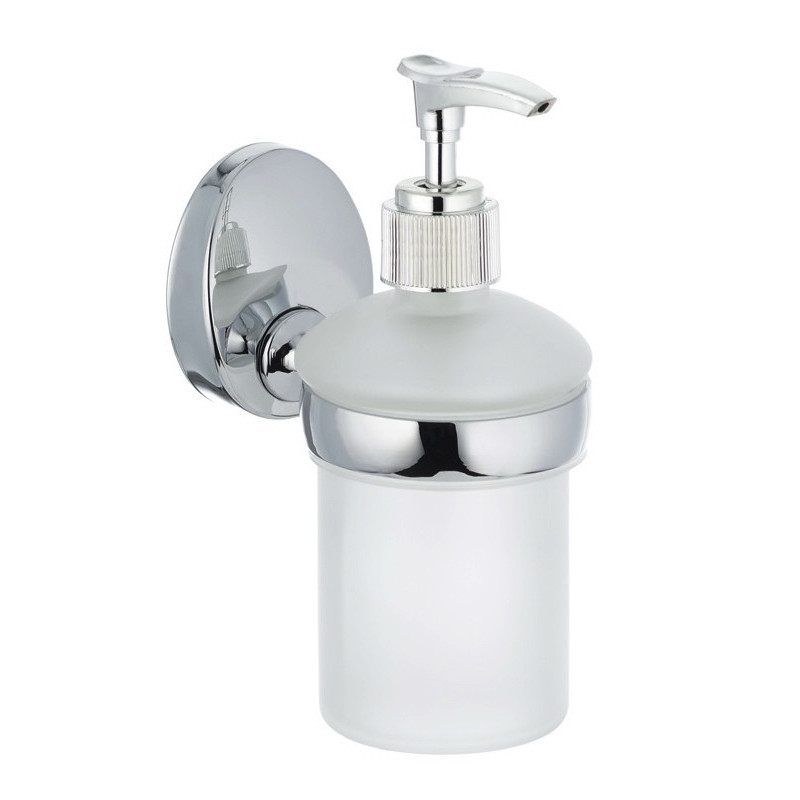 Стильний скляний диспенсер для рідкого мила наливного типу, виготовлений з міцного матового скла, в хромованій підставці, виконаний у вигляді колби з вакуумним нагнітачем, закріпленим на кронштейні. Кронштейн кріпиться на стіну, виконаний з хромованої латуні. Дозатор для рідкого мила практичний і компактний, зручний у використанні, легко миється. Один з необхідних предметів для будинку диспенсер для рідкого мила гармонійно впишеться в інтер'єр і не займе багато місця.