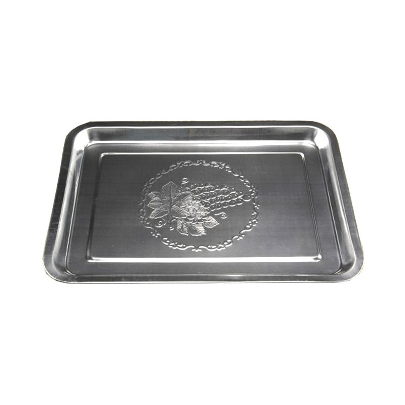 Піднос виготовлений з високоякісної нержавіючої сталі, що забезпечує цьому товару надійне і довговічне використання будинку, в кафе і ресторанах. Піднос має прямокутну форму із закругленими краями. На дні підноса виконаний карбований декор у вигляді виноградного грона. Наявність прямих бортів забезпечує зручність при перенесенні і поданні на нім або з нього різного посуду, чайних і кавових приладів і приладдя. Також рознесення може використовуватися для красивого подання десертів, фруктів, різної нарізки і інших напоїв і блюд.