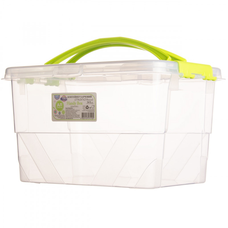Контейнер прозорий Handy Box 14л з ручками виготовлений з високоякісного харчового пластика, який може контактувати з їжею, абсолютно безпечний для здоров'я, не містить шкідливих речовин. Бокс для харчових продуктів з ручками кліпсами, прямокутний з кришкою призначений для зберігання і транспортування продуктів харчування і дрібних побутових предметів, також підходить для зберігання речей, одягу, дитячих іграшок і інших необхідних дрібниць домашнього використання, дуже зручний для пікніка. Ємність комплектується кришкою з ручками, яка щільно закривається і додатково фіксується ручками контейнера з двох сторін, це перешкоджає випадковому відкриттю кришки. Прозорі стінки судка дозволяють переглядати вміст в ньому.