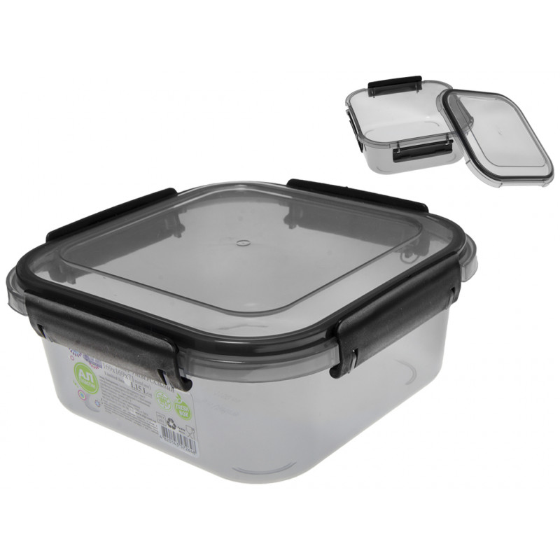 Контейнер чорний прозорий 1,15л з герметичною кришкою, квадратної форми, виготовлений з високоякісної харчової пластмаси, яка може контактувати з їжею, абсолютно безпечна для здоров'я, не містить шкідливих речовин, не вбирає сторонні запахи і не має свого. Ємність для продуктів призначена для зберігання і транспортування свіжих і заморожених продуктів, ягід, фруктів, овочів, а також зручно використовувати для розігріву їжі в мікрохвильовій печі. Бокси контейнери з харчового пластика з засувками незамінні для тих, хто любить відпочивати на природі. Ємність комплектується кришкою, яка щільно закривається, це перешкоджає випадковому відкриттю кришки.