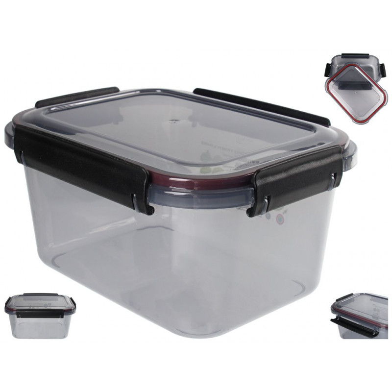 Контейнер чорний прозорий 2,4л з герметичною кришкою, прямокутної форми, виготовлений з високоякісної харчової пластмаси, яка може контактувати з їжею, абсолютно безпечна для здоров'я, не містить шкідливих речовин, не вбирає сторонні запахи і не має свого. Ємність для продуктів призначена для зберігання і транспортування свіжих і заморожених продуктів, ягід, фруктів, овочів, а також зручно використовувати для розігріву їжі в мікрохвильовій печі. Бокси контейнери з харчового пластика з засувками незамінні для тих, хто любить відпочивати на природі. Ємність комплектується кришкою, яка щільно закривається, це перешкоджає випадковому відкриттю кришки.