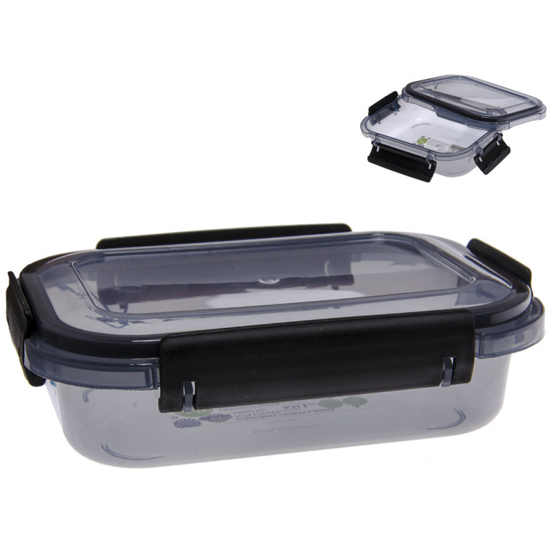 Контейнер чорний прозорий 0,51л з герметичною кришкою, прямокутної форми, виготовлений з високоякісної харчової пластмаси, яка може контактувати з їжею, абсолютно безпечна для здоров'я, не містить шкідливих речовин, не вбирає сторонні запахи і не має свого. Ємність для продуктів призначена для зберігання і транспортування свіжих і заморожених продуктів, ягід, фруктів, овочів, а також зручно використовувати для розігріву їжі в мікрохвильовій печі. Бокси контейнери з харчового пластика з засувками незамінні для тих, хто любить відпочивати на природі. Ємність комплектується кришкою, яка щільно закривається, це перешкоджає випадковому відкриттю кришки.