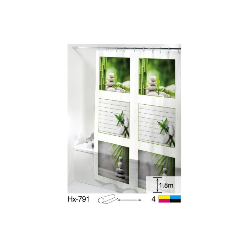 Штора для душу виготовлена з високоякісної клейонки з водовідштовхувальним просоченням, призначена спеціально для приміщень з підвищеною вологістю. Зносостійкий матеріал не линяє і не вицвітає, не викручувати, шторка швидко сохне і має довгий термін експлуатації. Шторка із зручними розмірами охоплює ванну повністю, тому добре захищає від розбризкування води, верхній край шторки з отворами для кілець, які йдуть у комплекті.