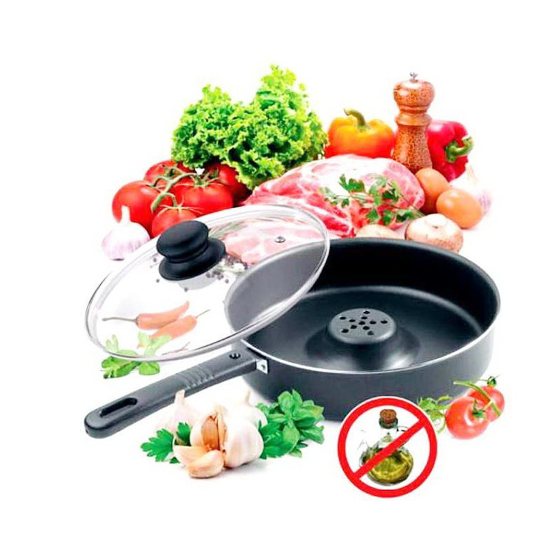 Сковорода Драй Кукер виготовлена з високоякісної сталі, яка характеризується високою теплопровідністю та має антипригарне покриття – екологічно придатне для термічної обробки їжі. Сковорода з кришкою діаметром 26см допоможе Вам готувати будь-яку їжу без застосування олії та інших жирів. Це одночасно і сковорода та пароварка, яка готує за допомогою гарячого повітря, повністю змінить звичний стиль приготування їжі. Сковорода збереже всі корисні речовини та вітаміни усередині продуктів.