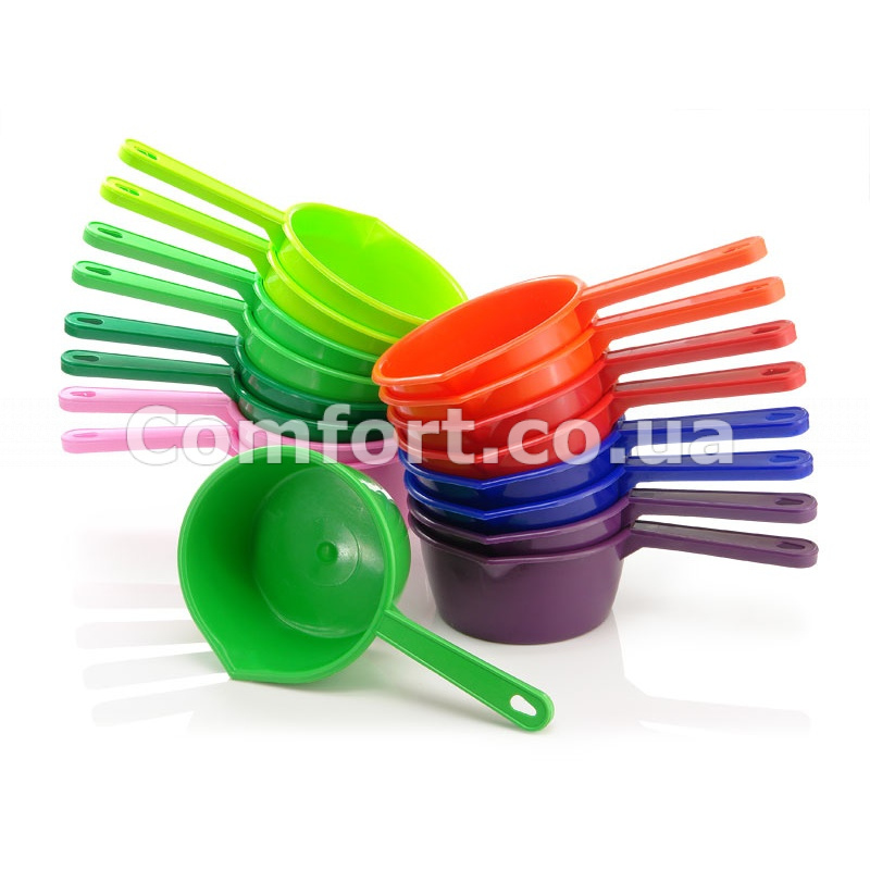 Ковшик пластмасовий з довжиною ручкою і мірною шкалою призначений для переливання води і інших рідин, а також сипких продуктів. Довга ручка дозволяє зручно утримувати повністю наповнений ківшик. Передбачений носик для зливу води, на ручці є отвір для підвішування, що дозволяє економити місце при зберіганні ківшика.