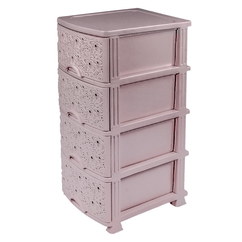 Комод ажурний люкс пластмасовий має чотири висувні ящики, в які легко поміщаються усі необхідні речі. Комод використовується для зберігання одягу, постільної білизни, дитячих іграшок, предметів особистої гігієни, банного приладдя, косметики, рушників, серветок і інших необхідних дрібниць. Підлоговий комод виготовляють з кольорової високоякісної пластмаси, декорують ажурним візерунком.