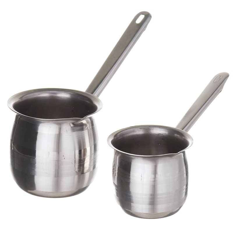 Турка для кави, що називається ще джезві, ибрик і далла - спеціальний посуд для приготування кави, що прийшла до нас зі сходу, причина популярности приготування кави в турку криється в принципі перевіреного поколіннями способу: у вузькій горловині посудини мелений кавовий порошок перешкоджає виходу ароматичних речовин і кофеїну. Турка відмінний подарунок для рідних і близьких, виготовлена з нержавіючої сталі. Набор складається з двох турок різного розміру.