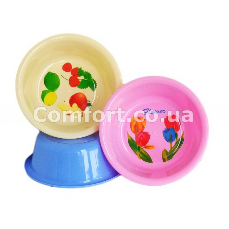 Миска пластмасова призначена для зберігання і сервіровки салатів, фруктів, ягід, можна використати для замісу тіста. Миска підходить для використання в мікрохвильовій печі і миття в посудомийній машинці, виготовлена з кольорової пластмаси, дно оформлене веселими малюнками.