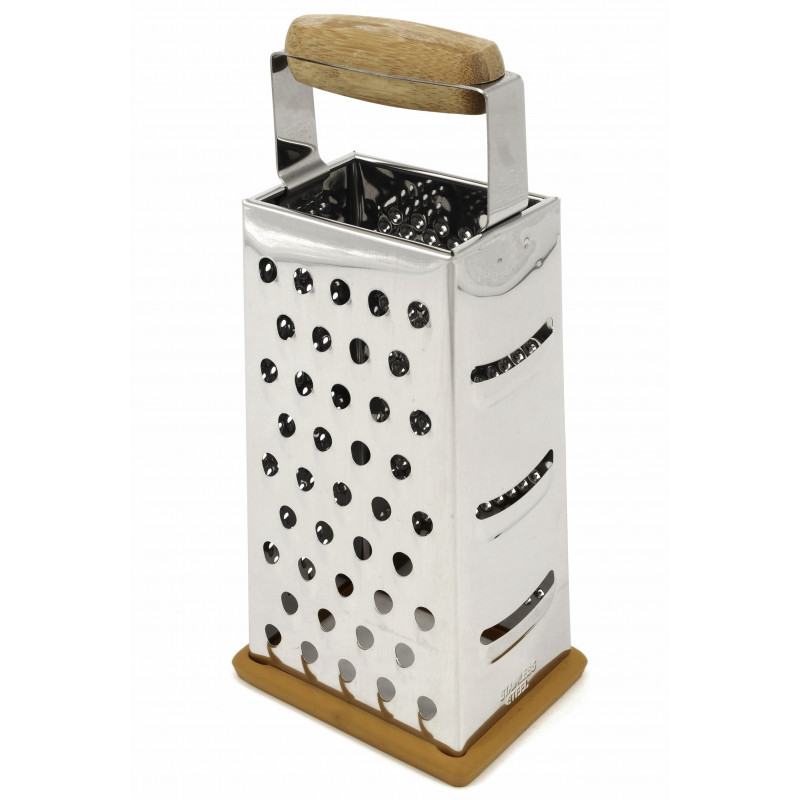Терка необхідний предмет на будь-якій кухні, вона має чотири робочі теркові грані, призначена для різних подрібнень та нарізки овочів, фруктів, сиру, горіхів, шоколаду чи інших продуктів. Терка виготовлена з високоякісної нержавіючої сталі, цей метал не вступає в реакцію з їжею під час експлуатації, а отже, не змінює її смаку та запаху. Ергономічна дерев'яна ручка і силіконова основа, що не ковзає, забезпечать зручність і безпеку при використанні металевої терки. Терка шатківниця квадратна, легко миється навіть у прохолодній воді, не вбирає запахи, її можна мити в посудомийній машині.